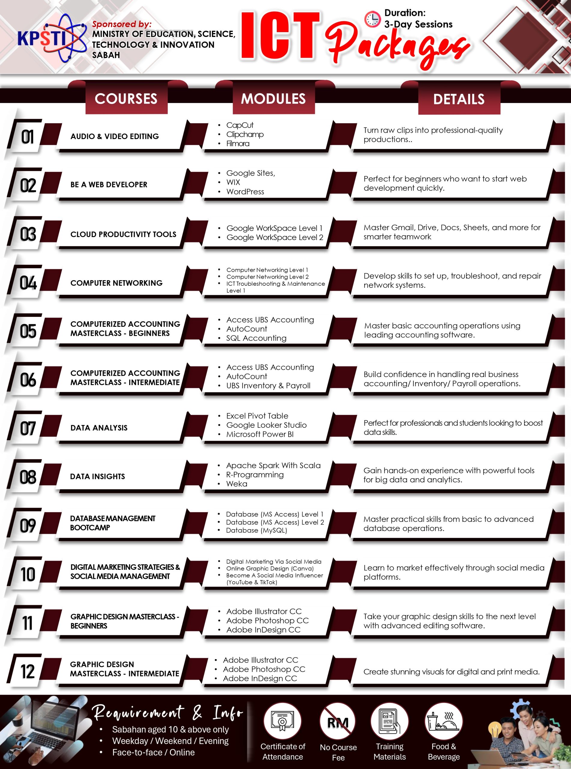 - At least 18 years old for 3 days ICT courses